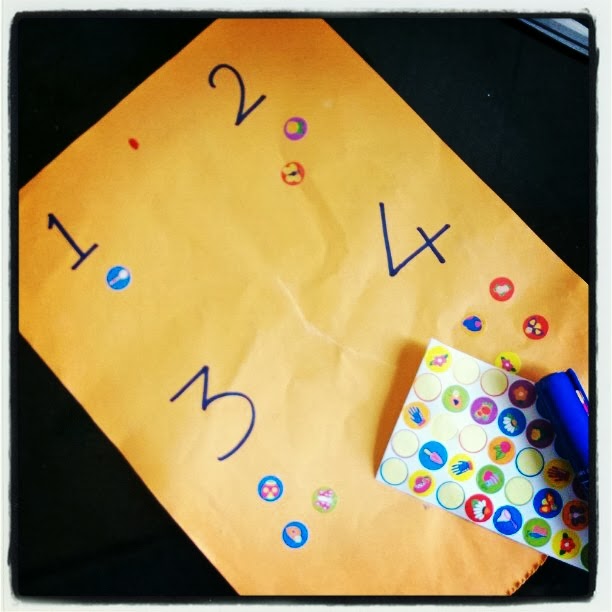 على ورقة كبيرة اكتبى بعض اﻷرقام (وليكن 1و2و3) ثم ساعدى طفلك على وضع ملصقات تحت كل رقم حسب العدد, يمكن اجراء تعديل على نفس اللعبة واستخدام اغطية الزجاجات أو المكعبات او الحبوب او اﻻزرار للغرض نفسه.