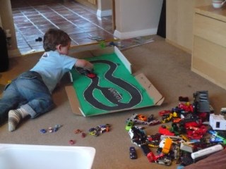 بعدها يمكنك أن ترسمى عليه طريق لسباق سيارات طفلك الصغيرة…. المساحة كبيرة بما يكفى للسيارات و جوانب الصنوق ستحتفظ بها فى مكان ثابت…