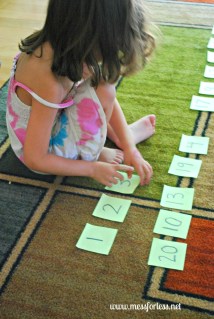 على اوراق صغيرة متساوية فى الحجم…يمكن صنعها من ورقة عادية او بشراء تلك الرزمة الملونة المقطعة الجاهزة…اكتبى اﻷرقام..حسب عمر طفلك من ١ الى ١٠ أو اكثر اذا كان طفلك يستطيع العد الى اكثر من ١٠