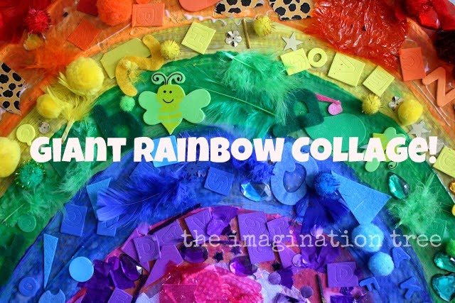 ترسمان معا قوس قزح على ورق مقاس الفرخ ثم تجمعان معا الكثير من أغراضا مختلفة بألوان قوس قزح ويخمن الطفل اين يضع اللاصق حسب لونه