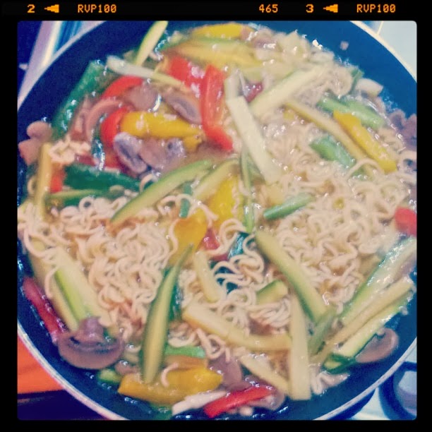 | العشاء: نودلز على الطريقة الصينية, كوب من النودلز بعد طبخها(باكيت اﻻندومى يصنع وجبة لشخصين) مع ٣ ثمرات كوسة و ٢ جزر و كوب فلفل الوان و صدر دجاج مقطع شرائح رفيعة. نصف كوب مشروم |