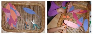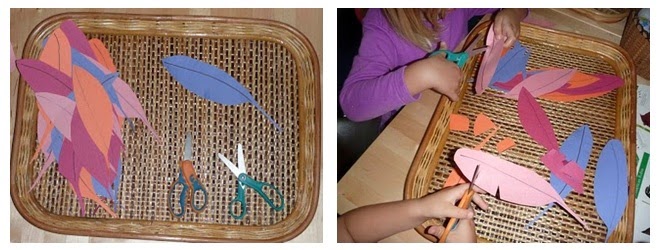 تنويع لنفس الفكرة ان نرسم شكل الريشة على عدة اوراق و يقوم الطفل بقص مثلثات صغيرة جدا ليعطى احساس الريشة الحقيقية.