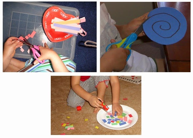 الخطوة التالية ان يقص قطع صغيرة من الورق الملون ليتم لصقها كزينة للحلزون وبالتالى تدريب مختلف على نفس المهارة