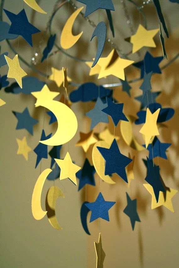 اذا كان اوﻻدك مثل اوﻻدى يستمتعون بالشخبطة على اﻷوراق و خصوصا باﻷلوان المائية فلابد ان لديك كما من اﻷوراق الملونة يمكنك ان تضعى كومة منها فوق بعضها و تقصيها على شكل النجمة كما فى الصورة أو أى شكل تشعرين انه مناسب للعيد…مثلا الهلال او الخروف…ثم تعليقى اكثر من واحدة على خيط صوفى…ويمكن ان يساعدك اﻷولاد فى اللصق و تعليق الحبال بعد ان تنتهوا